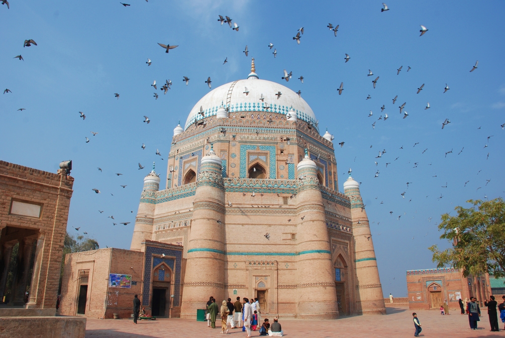 The Shrine of Shah Shamas Tibraiz, located in Multan, Pakistan, is a revered Sufi shrine dedicated to the 12th-century Sufi saint, Shah Shamas Tibraiz. The shrine is a beautiful example of Islamic architecture, with intricate tile work, ornate calligraphy, and geometric patterns adorning its surface.